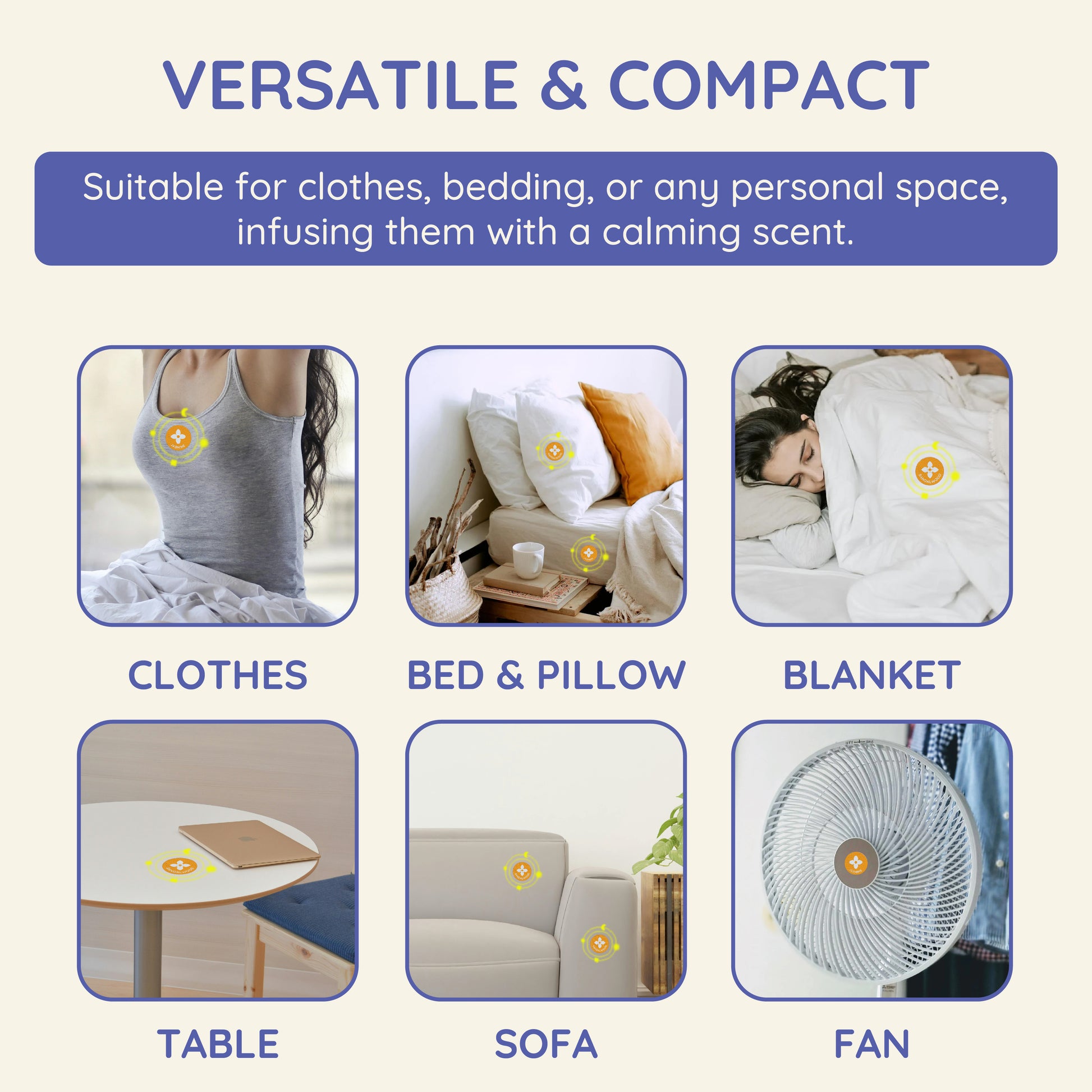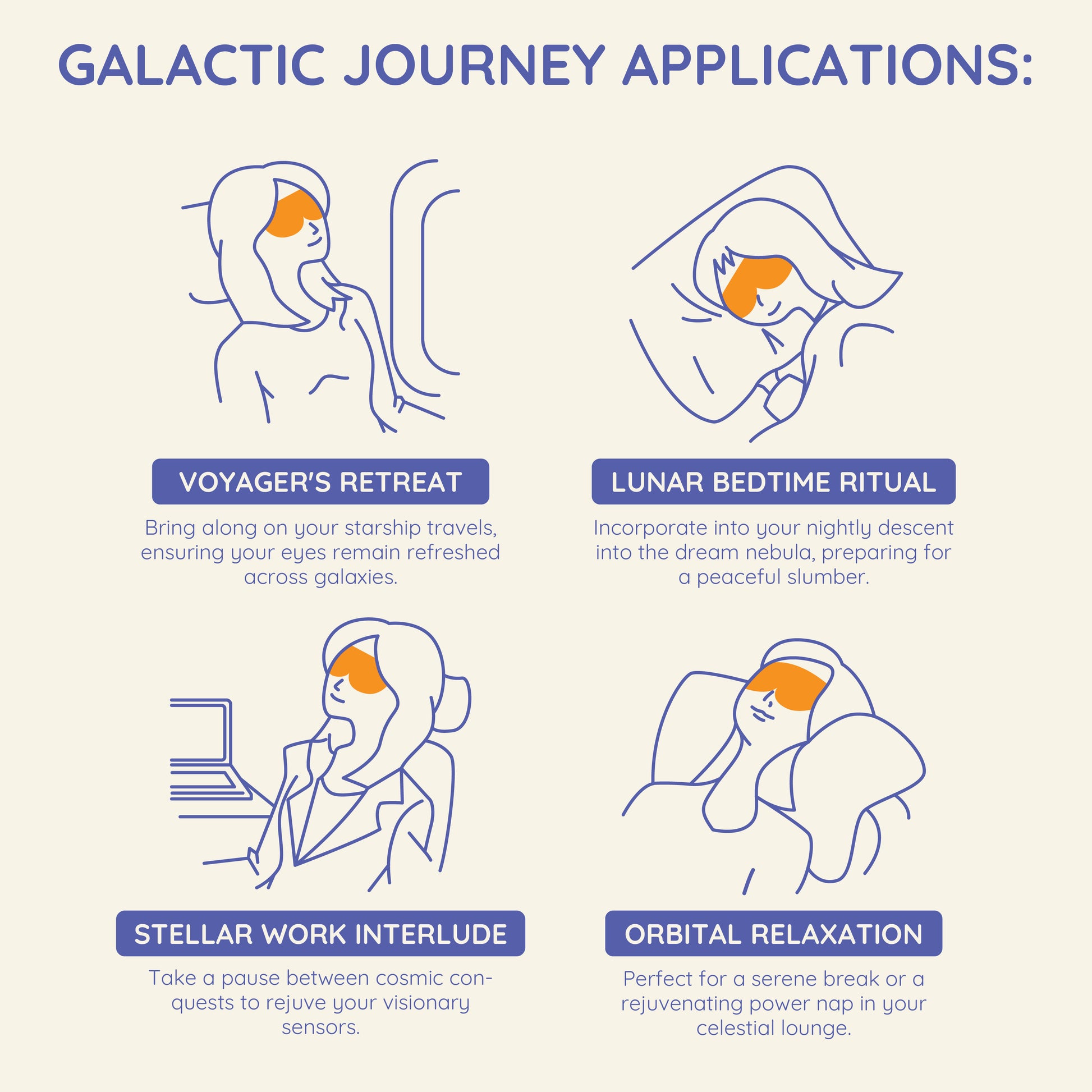 How to Use: Unwrap a Nebula Soothe Eye Pad and place it over your closed eyelids. The self-heating mechanism will activate upon exposure to air, providing comforting warmth. Select either a Galaxy Jasmine or Sandalwood Aroma Sticker and place it on a nearby surface, like a nightstand or pillowcase. The soothing heat from the eye pad, combined with the calming or uplifting aroma, will prepare you for a peaceful night’s sleep.