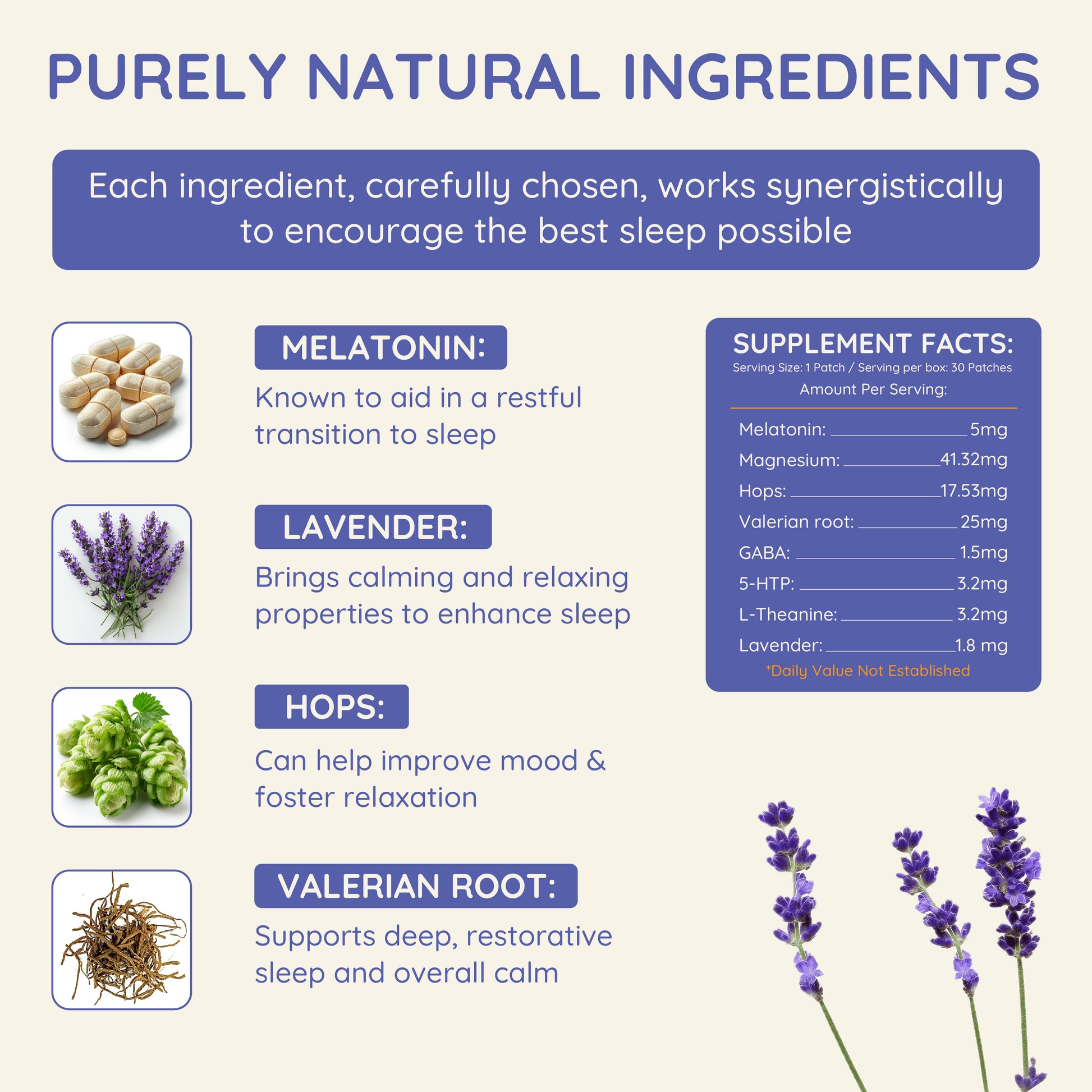 - Calming Ingredients: Each patch contains a special blend of Melatonin, Magnesium, Hops, Valerian Root, GABA, 5-HTP, L-Theanine, and Lavender—all known for their sleep-enhancing and calming properties.